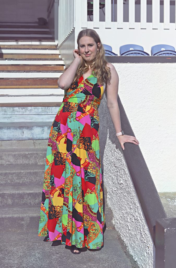 Gorgeous maxi dress, halter top design, open back, zip closure at back.
