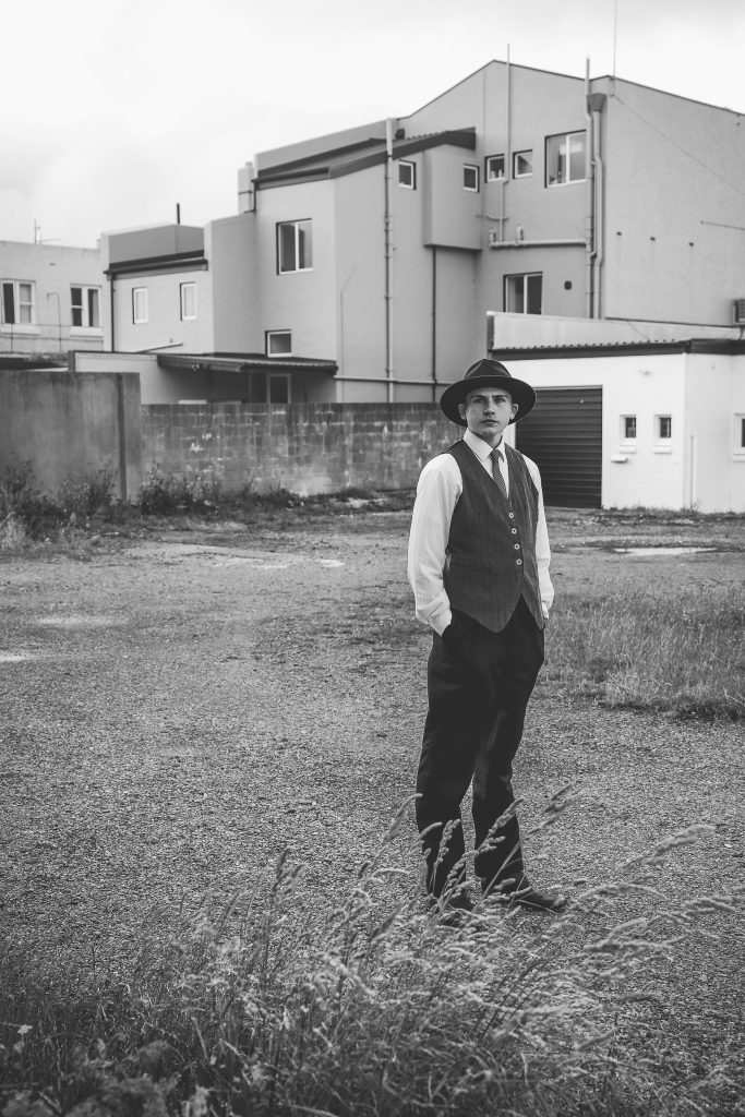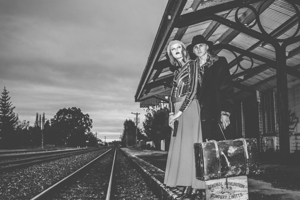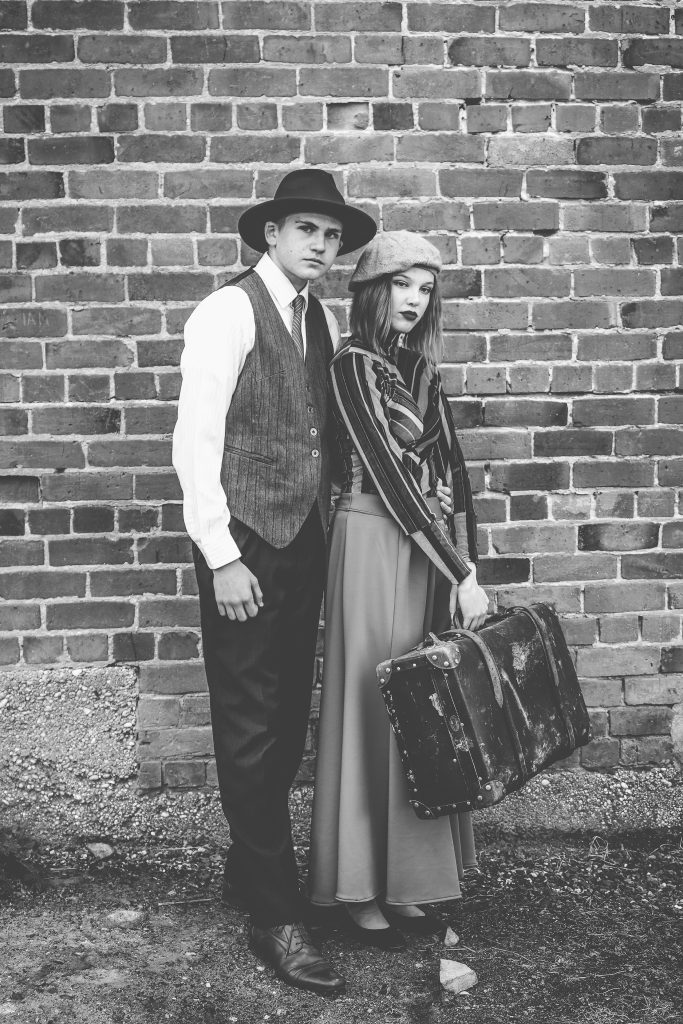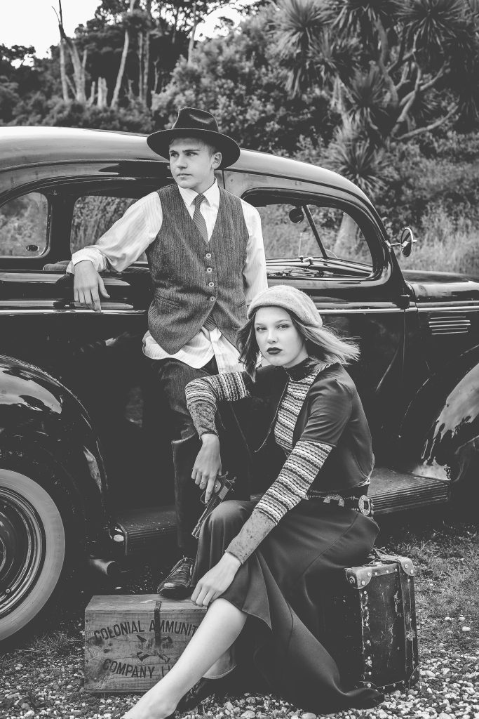 Bonnie and Clyde inspired concept photo shoot featuring models Laura Horton as Bonnie and Morgan Calder as Clyde.